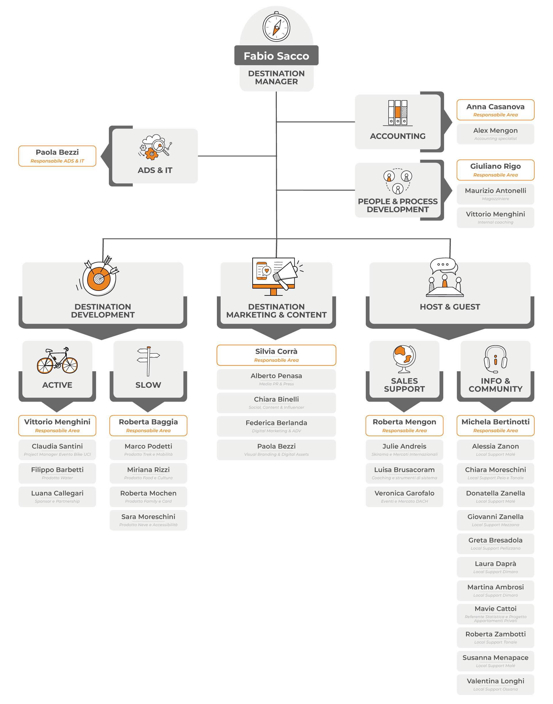 Il Destination Manager opera a diretto riporto dell’Consiglio di Amministrazione per il corretto svolgimento delle attività aziendali. Si avvale del supporto di uno staff con funzioni trasversali e organizzato in 3 aree di supporto (Accounting, ADS & IT e People & Process Development) e 3 aree operative (Destination Development, Destination Marketing & Content, Host & Guest).
